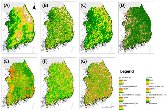 We curated a set of seven variables, including elevation, distance to road, distance to river, distance to forest, distance to urban areas, distance to cropland, and vegetation index, which were selected based on their anticipated influence on the selection of potential wild boar habitats and ASF-managed areas (Figure 4) [37,55,56]. All the environmental and anthropogenic variables were transformed into raster data at a consistent resolution of 1 km. Forest, cropland, and urban areas -specifically forest, cropland, and built-up cover - were extracted from the European Space Agency (ESA) WorldCoverV200 dataset. These datasets serve as essential proxies for land cover characteristics. The following descriptions were used to derive the environmental variables:
