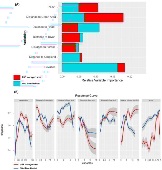 Notably, NDVI and distance to forest, two less influential variables, displayed distinct response curve patterns. The estimation of wild boar habitat suitability revealed an increase in suitability in areas farther from forests, with higher NDVI values. However, the distance to the forest variable did not exhibit significant patterns while estimating the suitability of ASF-managed areas. Furthermore, NDVI influenced the estimation of ASF-managed area suitability at the highest values.
