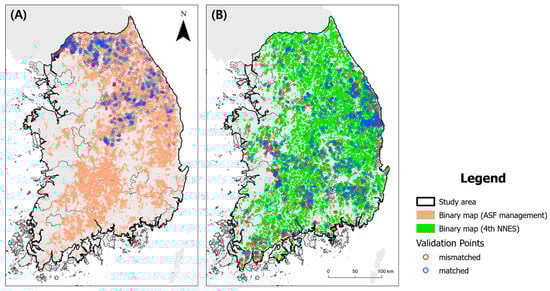 Binary map and validation points of ASF management model (A) and wild boar habitat model (B).