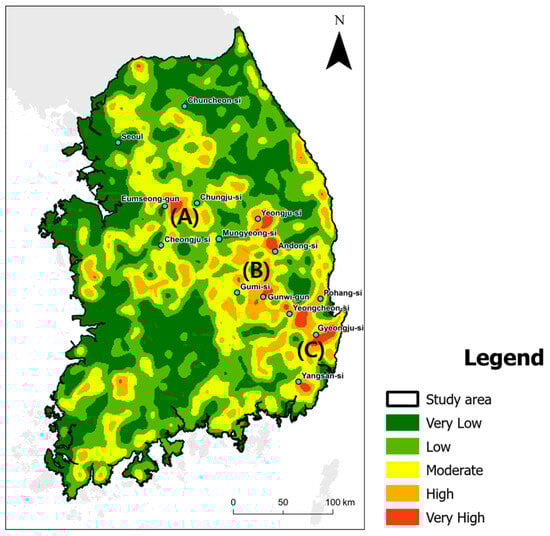 To evaluate the disparities between potential wild boar habitats and ASF-managed areas, and to estimate the areas where these disparities were concentrated creating a potential risk for ASF transmission, we conducted a comparative analysis of two binary maps. The KDE analysis resulted in a density map with values ranging from 0~0.43, and we classified these values into five levels (very low: 0~0.1, low: 0.1~0.2, moderate: 0.2~0.3, high: 0.3~0.4, very high: 0.4~0.5) (Figure 7). The observed disparities were not uniformly distributed across the country, rather exhibited sporadic distribution patterns. Dense forests and intensely developed regions, such as Seoul, Chuncheon-si, Chungju-si, and Cheongju-si were evaluated as areas of very low to moderate disparity. The areas in which the urban and forest regions were mixed were evaluated as having high or and very high disparities, such as Eumseong-gun in Chungcheongbuk-do Province (designated as A), Yeongju-si in Gyeongsangbuk-do Province (designated as B), and the mountainous expanse extending from Yeongcheon-si in Gyeongsangbuk-do Province to Gyeongju-si in Gyeongsangnam-do Province (designated as C).