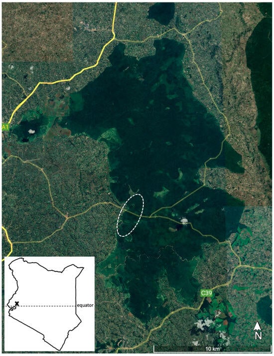 Long-term research on blue monkeys has taken place in an area of ca. 2 km2 (dashed oval in Figure 1) surrounding the Kakamega Forest Station, located in the mid-western part of the forest (0°19′ N, 34°52′; [11]). This part of the forest is managed by the Kenya Forest Service, in contrast to the most northern region which falls under Kenya Wildlife Service supervision [18,22]. Our Kenyan co-authors come from the community inhabiting the area near the study site (Figure 1): all of them grew up in this area, no more than 5 km from the forest edge, and their families have inhabited this region for multiple generations.