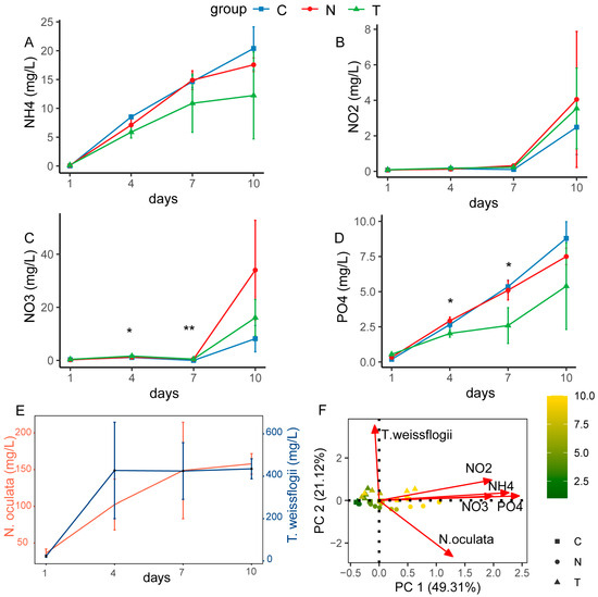 Variations in microalgal and nutrient factors of rearing water during experiment period in Group N (filtered rearing water inoculated with N. oculata), Group T (filtered rearing water inoculated with T. weissflogii), and Group C (control, filtered rearing water). (A–D) Changes in nutrient factors. (E) Changes in N. oculata and T. weissflogii biomass. (F) Principal components analysis (PCA) of microalgal and nutrient factors. “*” represents a significant difference among groups on the same day (* p < 0.05, one-way ANOVA. ** p < 0.01). Error bars represent standard errors of the means (n = 3).