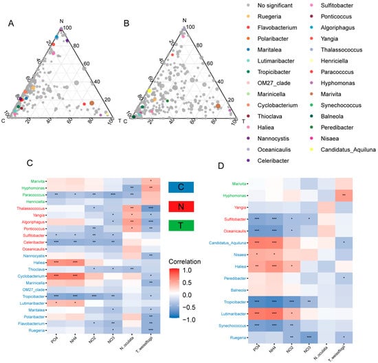 Indicator species analyses and likelihood ratio tests were employed to identify the representative genera of different microalgal treatments in the PA and FL bacterial communities. A total of 23 and 14 genera were identified in the PA and FL bacterial communities, respectively (Figure 3). Among them, three genera (Ruegeria, Tropicibacter, and Haliea) in Group C, three genera (Oceanicaulis, Sulfitobacter, and Yangia) in Group N, and two genera (Hyphomonas and Marivita) in Group T were the representative genera for both the PA and FL bacterial communities (Figure 3). Moreover, in the PA bacterial communities, N. oculata specifically enriched Celeribacter, Ponticoccus, Algoriphagus, and Thalassococcus (Figure 3A), while T. weissflogii specifically enriched Paracocccus and Henriciella (Figure 3A). For Group C, nine genera, including Polaribacter, Marinicella, and Thioclava, could specifically represent PA bacterial communities (Figure 3A), while six genera, including Synechococcus, Lutimaribacter, and Balneola, could specifically represent PA bacterial communities (Figure 3B). Spearman’s correlation coefficients were calculated between the representative bacteria and each environmental factor. Almost every genus was significantly (p < 0.05) correlated with at least one environmental factor (Figure 3C,D).