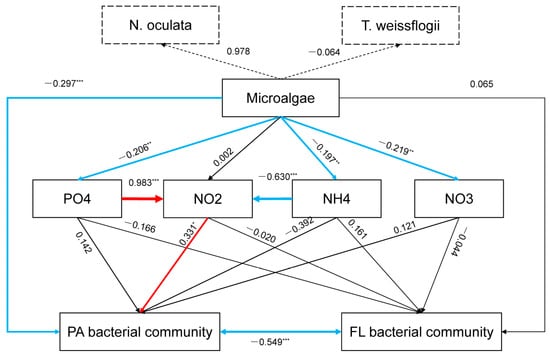 Overall, the PA and FL bacterial communities were significantly associated with nutrient factors (PC1) based on the Mantel test, but no significant associations were identified with microalgae (PC2) (Table 2). CCA also highlighted the influence of nutrient factors on bacterial community composition (Figure S5). However, PLS-PM analysis showed that microalgae could directly affect the PA bacterial community and nutrient factors PO43− and NH4+ (Figure 4). Furthermore, the affected PO43− and NH4+ had significant positive and negative influences on NO2−, respectively (Figure 4). Moreover, there were significant interactions between the PA and FL bacterial communities (Figure 4).