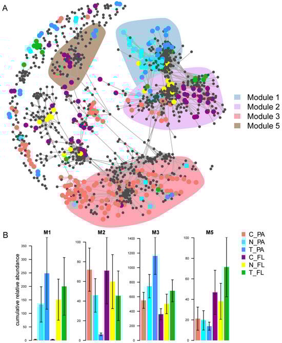 A co-occurrence network containing 7872 ZOTUs and 1364 significant positive correlations was constructed, and four modules (M1, M2, M3, and M5) that contained relatively high proportions of the representative bacteria from different treatments (Figure 5A) were found. Specifically, M1 was made up of bacteria that were significantly represented in the microalgal treatment groups, while M2 was made up of bacteria that were significantly represented in the control group (Figure 5B). Moreover, representative PA bacteria were mostly associated with M3, while representative FL bacteria were mostly associated with M5 (Figure 5B). Regression analyses of bacterial co-occurrence patterns and environmental factors revealed that all the modules were significantly correlated with PC1, but only M3 was significantly correlated with PC2 (Table 3).