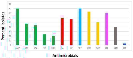 Most isolates proved to be resistant to TET (24/30; 80%), AMP (24/30; 80%), SMX (22/30; 73.33%), CHL (21/30; 70%) and NA (18/30; 60%). High levels of resistance to TET, as well as NA have been previously highlighted in the case of various important foodborne pathogens in our country, including E. coli and seems to be common and well documented [37,47]. It has been considered that such rates of resistance to these particular antimicrobials might be related to their frequent use in the prophylaxis and treatment of digestive conditions of food producing animals [49].