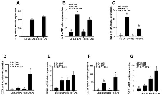 Effects of glucose concentrations on inflammation regulation and inflammatory cytokine gene expression of LPS-induced BMECs. BMECs were treated with 4 μg/mL LPS and different concentrations of glucose (2.5 and 17.5 mM). After incubation, the cells were collected for qRT-PCR. (A) IL-1β, (B) IL-6, (C) TNF-α, (D) CXCL2, (E) CXCL6, (F) CXCL8, and (G) CCL5. LG, low-glucose (2.5 mM) DMEM; LG + LPS, low-glucose (2.5 mM) DMEM with 4 μg/mL LPS; HG, high-glucose (17.5 mM) DMEM; HG + LPS, high-glucose (17.5 mM) DMEM with 4 μg/mL LPS; A, LPS addition; B, glucose content; A × B, interaction between LPS and glucose content. Different lowercase letters (a–d) in the bar chart indicate significant differences (p < 0.05).