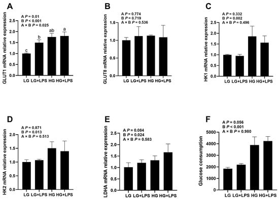 For LDHA gene expression (Figure 2E), LPS-induced BMECs had an upward tendency (p = 0.084), while the high concentration of glucose increased (p < 0.05). The LG + LPS group and the HG group had a rising trend (p = 0.052), while the HG + LPS group enhanced its expression (p < 0.05) of LDHA compared with the LG group.