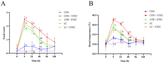 Effects of dietary LC on the fecal scores and rectal temperature in ETEC-challenged piglets. (A) The fecal scores were evaluated at 0 h, 9 h, 24 h, 48 h, 96 h, and 168 h after challenge with ETEC according to the fecal scoring system reported by Marquardt et al. (0: normal, hard form; 1: soft feces, soft form; 2: mild diarrhea, no form, loose, puddles; 3: severe diarrhea, watery). (B) Rectal temperatures were measured using an electronic rectal thermometer (Omron MC-347) at 0 h, 9 h, 24 h, 48 h, 96 h, and 168 h in ETEC-challenged piglets. Data are expressed as the mean ± SE (n = 6). Different letters (a, b, and c) indicate a significant difference among the different groups (p < 0.05).