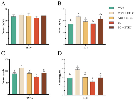 Effects of dietary LC on plasma inflammatory factors in ETEC-challenged piglets. Concentrations of IL-10 (A), IL-6 (B), TNF-α (C), and IL-1β (D) were assessed. Data are expressed as the mean ± SE (n = 6). Different letters (a, b, and c) indicate a significant difference among the different groups (p < 0.05).