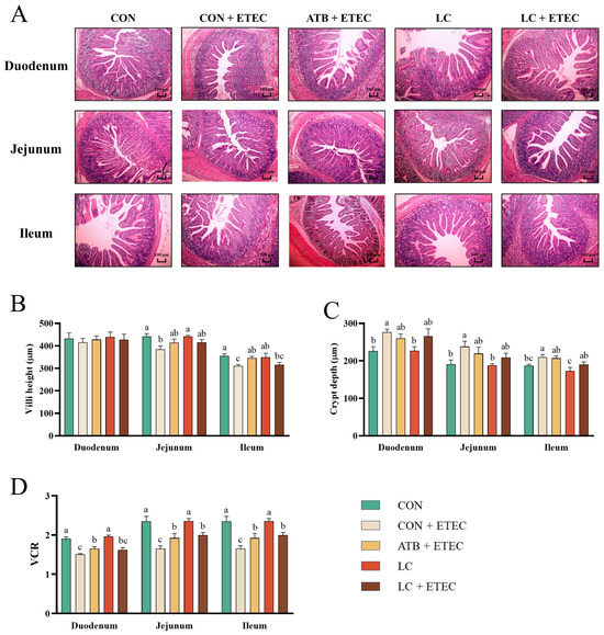 Effects of dietary LC supplementation on the intestinal morphology in ETEC-challenged piglets. (A) The hematoxylin and eosin (H&E)-stained intestinal cross-sections in piglets are shown. The scale bar represents 100 μm. (B) Villi height, (C) crypt depth, (D) ratio of villous height to crypt depth (VCR). Data are expressed as the mean ± SE (n = 6). Different letters (a, b, and c) indicate a significant difference among the different groups (p < 0.05).