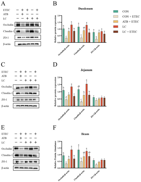 Similarly, the CON + ETEC group showed a significant decrease in tight junctions across all intestinal segments compared to the CON group (p < 0.05) (Figure 4A–F). Notably, the supplementation of LC into the diet led to an increase in Occludin expression throughout the intestinal tract relative to the CON treatment (p < 0.05) (Figure 4A–F). In addition, the protein expressions of Occludin, Claudin-1, and ZO-1 in the duodenum, Occludin and Claudin-1 in the jejunum, and Occludin in the ileum were significantly higher in the ATB + ETEC and LC + ETEC groups compared to the CON + ETEC group (p < 0.05) (Figure 4A–F). And there were no significant differences in intestinal tight junction protein expression between the ATB + ETEC and the LC + ETEC groups. Full original Western blot (WB) images of Figure 4 are shown in Figure S2.