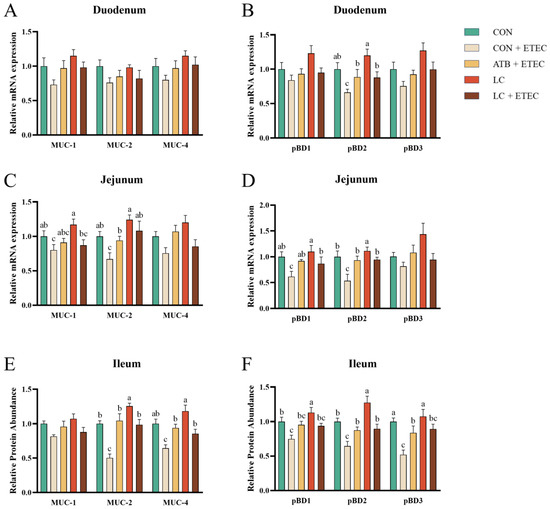 Effects of dietary LC supplementation on mRNA expression levels of mucin and β-defensin of piglets challenged with ETEC. The mRNA expression levels of mucin in the duodenum are presented in (A), while the expression levels of β-defensin are shown in (B). Similarly, (C) represents the expression of mucin mRNA in the jejunum, and (D) represents β-defensin expression. Additionally, (E,F) display the expression levels of mucin and β-defensin mRNA in the ileum. The data is presented as the mean ± SE (n = 6). Different letters (a, b, and c) indicate a significant difference among the different groups (p < 0.05). MUC, mucin; pBD, porcine beta-defensin.