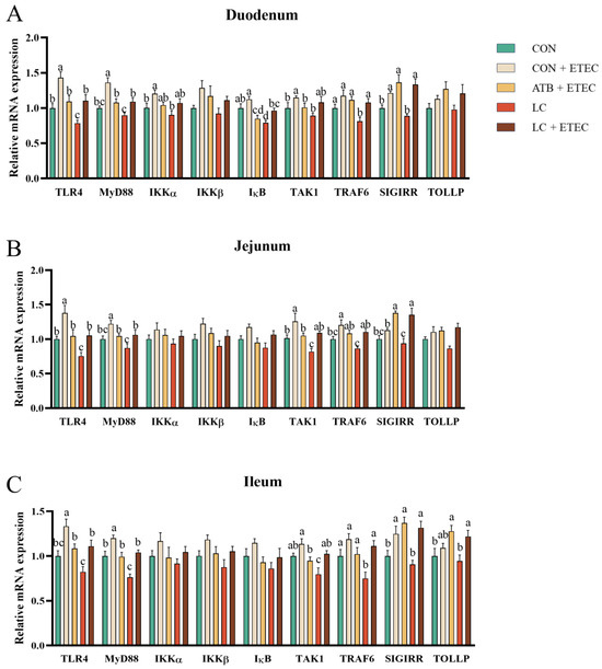 Effects of dietary LC supplementation on the concentration of relative mRNA expression of genes related to inflammation in ETEC-challenged piglets. (A) Duodenum, (B) jejunum, (C) ileum. The data are presented as the mean ± SE (n = 6). Different letters (a, b, and c) indicate a significant difference among the different groups (p < 0.05). TLR4, Toll-like receptor 4; NF-κB, nuclear factor kappa B; MyD88, myeloid differentiation factor 88; IKKα, inhibitor of NF-κB kinase α; IKKβ, inhibitor of NF-κB kinase β; TAK1, transforming growth factor β (TGF-β)-activated kinase 1; TRAF6, TNF receptor-associated factor 6; SIGTRR, Single Ig IL-1-related receptor; TOLLP, Toll-interacting protein.