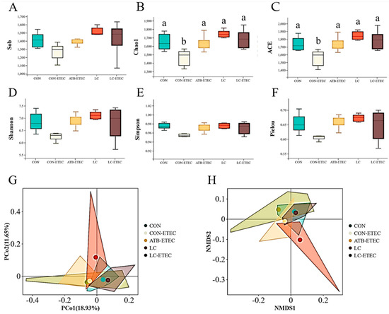 Effects of dietary on alpha diversity and beta diversity of ileal microbiota in ETEC−challenged piglets. (A–F) Alpha diversity index: Sob, Chao1, ACE, Shannon, Simpson, and Pielou. (G) Principal coordinates analysis based on Bray−Curtis distance. (H) Plot of NMDS analysis of Bray. Data are expressed as the mean ± SE (n = 6). Different letters (a, and b indicate a significant difference among the different groups (p < 0.05).