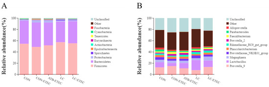 Effects of dietary LC supplementation on the microbial composition of ileal microbiota in ETEC-challenged Piglets. (A) Relative abundance in genus. (B) Relative abundance in species. Data are expressed as the mean ± SE (n = 6).