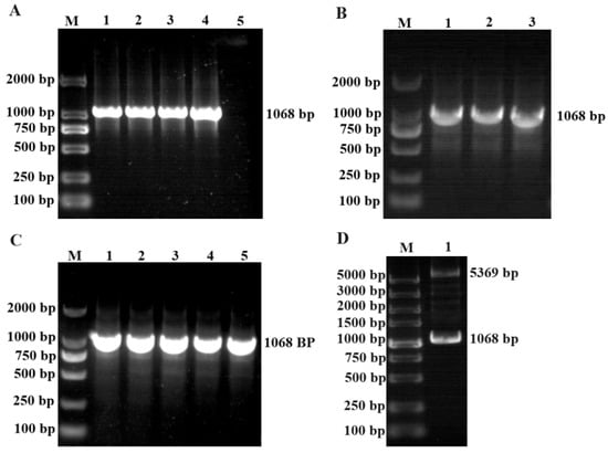 EtROP27 showed a specific band at 1068 bp after PCR amplification. Gene sequence and bioinformatics were analyzed, details in Supplementary Data S1 and S2. The PCR product was then cloned into the pMD-18T vector, and positive colonies were selected for bacterial liquid PCR and sequencing analysis (Figure 1A,B). The target fragment was cut out from the T vector and cloned into the pET-28a vector. Then, the positive colonies were selected with bacterial liquid PCR for double digestion identification and sequencing analysis (Figure 1C,D). The prokaryotic expression vector pET-EtROP27 was constructed successfully.