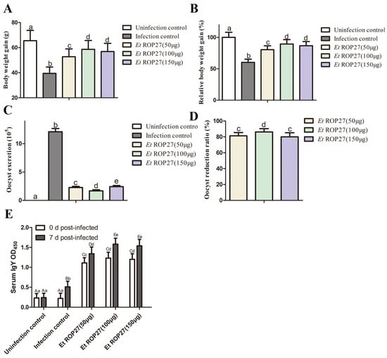 Effects of recombinant EtROP27 protein against the E. tenella challenge. (A) Body weight gain. (B) Relative body weight gain. (C) OPG. (D) Oocyst reduction ratio. (E) IgY concentration. All of the data are representative of at least three independent experiments. The same column of shoulder markers with the same lowercase letters indicates no significant difference (p > 0.05), shoulder markers with different lowercase letters indicate significant differences (p < 0.05), shoulder markers with different uppercase letters indicate extremely significant differences (p < 0.01).