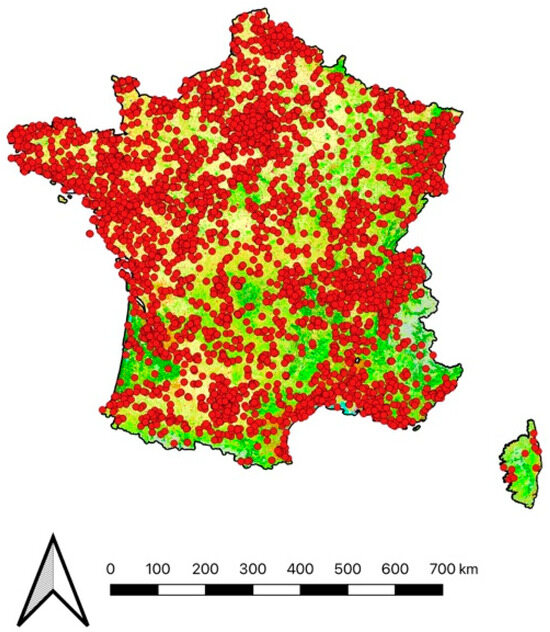 Location of the 36,568 preys brought home by cats over the 8-year period of survey. Reclassified Corine Land Cover 2018 in four categories: urban (grey), natural (green), agricultural (yellow), and water (blue).