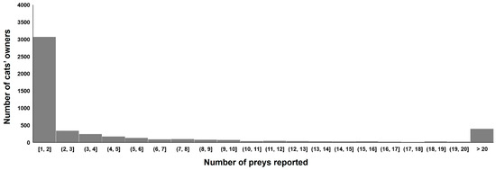 Over the 8-year survey period, 3073 cats’ owners only reported prey returned home once, while 2610 cats’ owners reported at least two preys, of which 812 were very active, reporting at least 10 prey items (Figure 2). The mean (±SD) length of time owners reported over was 3.1 months ± 5.0 months. The mean (±SD) number of individual cats followed by season was 2048.5 individuals ± 551.1. The mean (±SD) number of preys brought home by individual cats over the seasons was 4.5 preys ± 0.5.