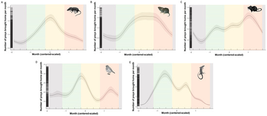 The predicted numbers of five main prey categories brought home per month by cats throughout the year: soricids (A), cricetids (B), murids (C), passerines (D), and lacertids (E). Curves represent cyclic splines fits with 95% confidence intervals as predicted by the GAMMs summarized in Table 1. Seasons are represented by transparent areas: winter (grey), spring (green), summer (yellow), and autumn (orange).