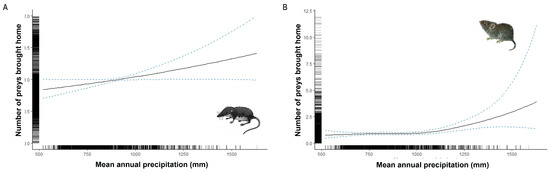 The predicted number of soricids (A) and cricetids (B) brought home by cats according to the mean annual rainfall. Curves represent cubic regression splines fits with 95% CI as predicted by GAMMs summarized in Table 1.