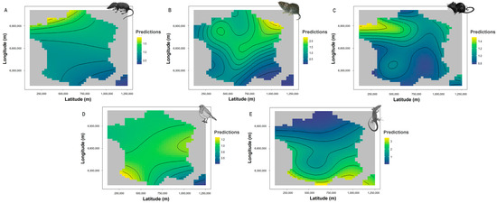 The predicted numbers of the five main prey categories brought home by cats according to latitude and longitude: soricids (A), cricetids (B), murids (C), passerines (D), and lacertids (E). A simple heatmap represents both variables and their interaction. The interior is a topographic map of predicted values with yellow to blue colours representing larger to smaller predictions.