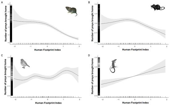 The predicted number of cricetids (A), murids (B), Passeriformes (C), and lacertids (D) brought home by cats according to the Human Footprint Index. Curves represent cubic regression splines fits with 95% CI as predicted by GAMMs summarized in Table 1.