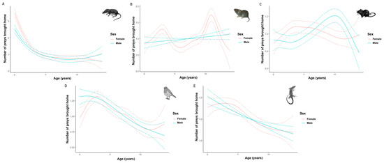 The predicted numbers of the five main prey categories brought home by cats according to their age and sex: soricids (A), cricetids (B), murids (C), passerines (D), and lacertids (E). Curves represent cubic regression splines fits with 95% CI (dashed lines) as predicted by GAMMs summarized in Table 1.