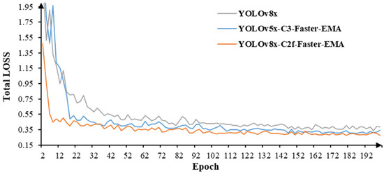 As illustrated in Figure 5 and Table 1, when considering the overall performance, the improved YOLOv8x outperformed the other two networks across most metrics. In terms of training box loss, the improved YOLOv8x achieved the lowest loss value, registering at 0.275, followed by the improved YOLOv5x and the original YOLOv8x with loss values of 0.302 and 0.340, respectively. Throughout the training epoch, due to structural similarities, the training losses exhibited clear trends, indicative of stable training. Upon the incorporation of the Faster-EMA module, YOLOv5’s performance exceeded that of YOLOv8, implying that the enhancement module effectively enhanced the network’s precision in segmenting smaller objects. Nevertheless, YOLOv8, which initially demonstrated superior performance, maintained its lead even with the enhancement module.
