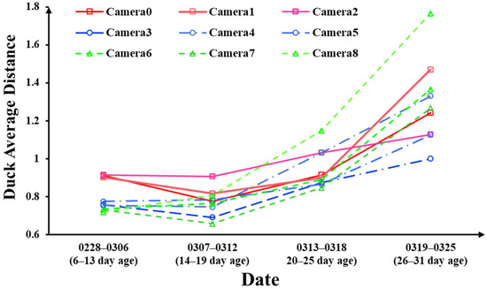 The SFAD data of meat ducks in nine cages were calculated. The results are shown in Figure 7, where each data point represents the SFAD for all meat ducks in the corresponding enclosure over a 6 min recording video.