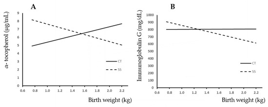 Figure 2A shows the relationship between BW and plasma α-tocopherol concentration. Completely opposite trends were observed between experimental groups. Thus, CT showed that as BW increased, the plasma concentration of α-tocopherol increased, whereas the SS group showed a decreasing trend of α-tocopherol as the BW increased. The slopes were different (p < 0.05).