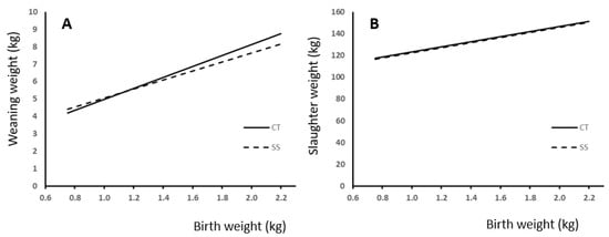 Relationship between birth weight and (A) weaning or (B) slaughter weight and the difference response according to the presence (SS) or absence (CT) of split-suckling treatment. (A—weaning weight: CT group (kg) = 3.12 (±0.287) × BW + 1.87 (±0.397); R2 = 0.33; p < 0.0001; SS group (kg) = 2.57 (±0.323) × BW + 2.50 (±0.45); R2 = 0.2; p < 0.0001). B—slaughter weight: CT group (kg) = 23.49 (±3.56) × BW + 99.68 (±4.92); R2 = 0.18; p < 0.0001; SS group (kg) = 23.26 (±4.05) × BW + 99.05 (±5.71); R2 = 0.15; p < 0.0001).