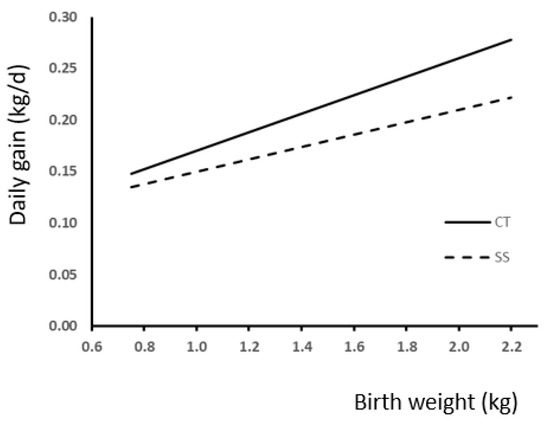 Relationship between birth weight and daily gain during the lactation period according to the presence (SS) or absence (CT) of split-suckling. (CT group, ADG (kg/d) = 0.09 (±0.013) × BW + 0.08 (±0.018); R2 = 0.17; p < 0.0001; SS group, ADG (kg/d) = 0.06 (±0.013) × BW + 0.09 (±0.018); R2 = 0.08; p < 0.0001).
