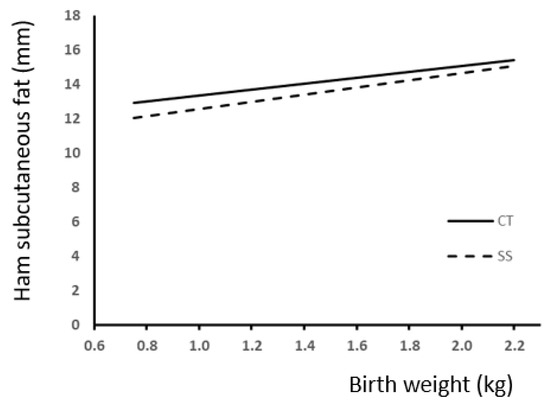 Relationship between birth weight and ham subcutaneous fat (SCF) accumulation according to the presence (SS) or absence (CT) of split-suckling. (CT group, SCF (mm) = 1.73 (±0.72) × BW + 11.6 (±0.99); R2 = 0.17; p < 0.01; SS group, SCF (mm) = 2.07 (±0.86) × BW + 10.5 (±1.21); R2 = 0.14; p < 0.01).