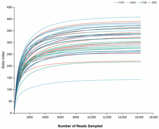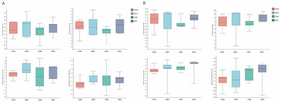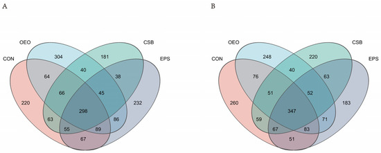 Microbial community diversity is explained by the Alpha diversity index and Beta diversity analysis (PCoA analysis). Alpha diversity is mainly used to study community diversity in a certain sample, and information such as species richness and diversity in environmental communities can be obtained by evaluating a series of Alpha diversity indexes. Four indices, Chao, Shannon, Simpsoneven and PD, were used in this experiment. The results showed no difference between the OEO, CSB, and EPS compared with CON, indicating that the three treatments had no significant effects on the richness, diversity, and uniformity of microbial communities. Beta diversity can be used to study the similarities or differences in sample community composition. The results of PCoA analysis showed that the microflora of each group could not be significantly separated, indicating that the microflora of each component did not have high stability and had no significant differences in microbial structure.