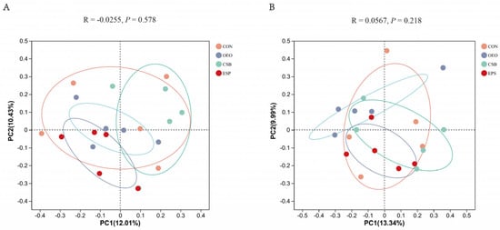 PCoA principal coordinate analysis. (A) PCoA analysis chart of calves before weaning. (B) PCoA analysis chart of calves after weaning. The horizontal and vertical coordinates represent the two selected principal coordinate components, and the percentage represents the contribution of the principal coordinate components to the differences in sample composition. The closer the R-value is to 1, the greater the between-group difference is than the within-group difference, and the smaller the R-value is, the less significant the between- and within-group differences are.
