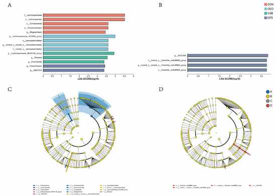 Linear discriminant analysis was used to analyze the differences between multilevel species (Figure 6A), trying to find the species with significant differences in different groups of dairy cows. Combined with the LDA effect value and p-value, the influence of fecal microbial species abundance on the difference effect was compared, and the different species were screened out (LDA score ≥ 3, p < 0.05). Results show that: Before weaning, the relative abundance of f__Lachnospiraceae, o__Lachnospirales, o__Coriobacteriales, c__Coriobacteriia and g__Megasphaera in CON increased significantly. The relative abundance of g__Lachnospiraceae_AC2044_group, o__Izemoplasmatales, g__norank_f__norank_o__Izemoplasmatales and f__norank_o__Izemoplasmata in OEO increased significantly, the relative abundance of g__Lachnospiraceae_NK4A136_group, g__Sharpea, g__Fournierella in CSB increased significantly. The relative abundance of g__Flavonifractor, g__UBA1819 in EPS increased significantly. After weaning, the relative abundance of o__Clostridia_vadinBB60_group, f__norank_o__Clostridia_vadinBB60_groupc, g__norank_f__norank_o__Clostridia_vadinBB60_group and g__UCG-004 in EPS increased significantly.
