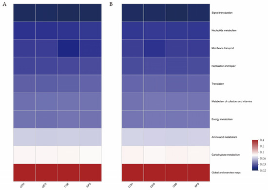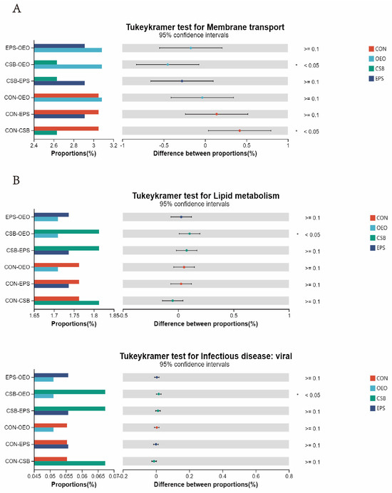 In the KEGG level 2 pathway (Figure 8), OEO significantly increased the membrane transport pathway before weaning (p < 0.05), and CSB significantly increased the lipid metabolism pathway, and Infectious disease: viral pathway after weaning. (p < 0.05).