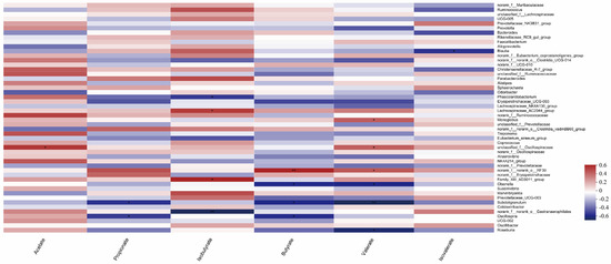 Correlation analysis of gut microbes and volatile fatty acids in calves (Note: The X-axis and Y-axis are environmental factors and species, respectively, and R and p-values are obtained by calculation. R-values are shown in different colors in the graph. If the p-value is less than 0.05, it is marked with a *. The legend on the right is the color interval of different R-values. You can choose to present a cluster tree of species and environmental factors (such as left and top). ** 0.001 * 0.01 < 0.05, or less p < 0.01).