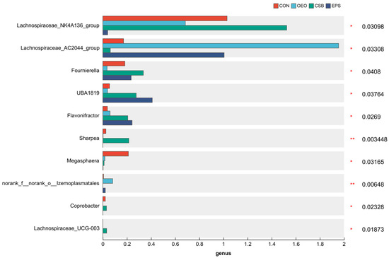 Gut microbial species of 55-day-old calves (at genus level). Horizontal coordinates indicate species names at different taxonomic levels, vertical coordinates indicate the percentage value of abundance of a species for that sample, and different colors indicate different groupings. The rightmost is the p-value, * 0.01 < p ≤ 0.05, ** 0.001 < p ≤ 0.01.