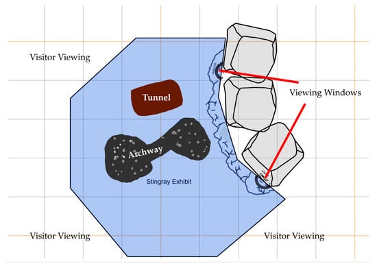All subjects were housed within the Stingray Bay Exhibit irregular nonagonal tank at Sea Life Michigan Aquarium, Auburn Hills, MI, USA. This aquarium is located within the Great Lakes Crossing Outlets Mall; thus, the aquarium is in a populous public area. The aquarium is open to the public every day from 10 a.m. to 6 p.m. (7 p.m. on Saturdays), except for certain holidays. The path through the aquarium travels through each exhibit, so visitors must travel through the Stingray Bay Exhibit to exit the aquarium. The tank had a volume of 20,500 L and a depth of approximately 1 m (39 in). The tank was kept on a 14:10 photoperiod, and water quality was held at 30–32 ppt salinity, with dissolved oxygen of 98–102%, pH of 7.7–8.0, and temperature of 23–24 °C. The habitat had two major fixtures: a large cylinder (seen as the tunnel in Figure 1) and a large stone archway (seen as the archway in Figure 1), along with a sandy substrate along the bottom of the tank. In addition to the focal rays, the tank also housed several white spotted bamboo sharks (Chiloscyllium plagiosum), a green moray eel (Gymnothorax funebris), and approximately 57 teleost fish of various species. The green moray eel generally remained within the large tunnel in the habitat, preventing its use by many of the other fish. Visitors were able to walk around and have visual access to almost all areas of the tank, except for a rocky outcropping toward the back of the tank where visitor viewing was limited to two viewing windows within a walkable tunnel (see Figure 1). Despite visitors being able to walk up to and look over the edges of the tank, touching the animals was not allowed.