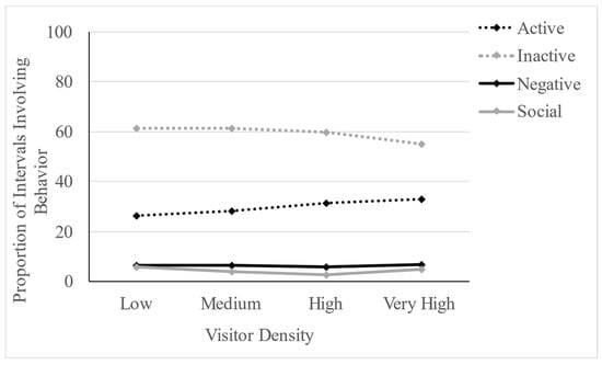 Our multilevel models indicated that visitor density predicted the presence of active behaviors (Z = 4.429, p < 0.001) and inactive behaviors (Z = −4.460, p < 0.001), but did not predict the presence of social (Z = −1.755, p = 0.079) or negative behaviors (Z = 0.576, p = 0.564). Active behaviors were 2.199% more likely to occur across each increase in level of visitor density, whereas inactive behaviors were 2.091% less likely to occur across each increase in level of visitor density. Figure 2 shows the changes in the proportion of observed behaviors across categories as visitor density increased.
