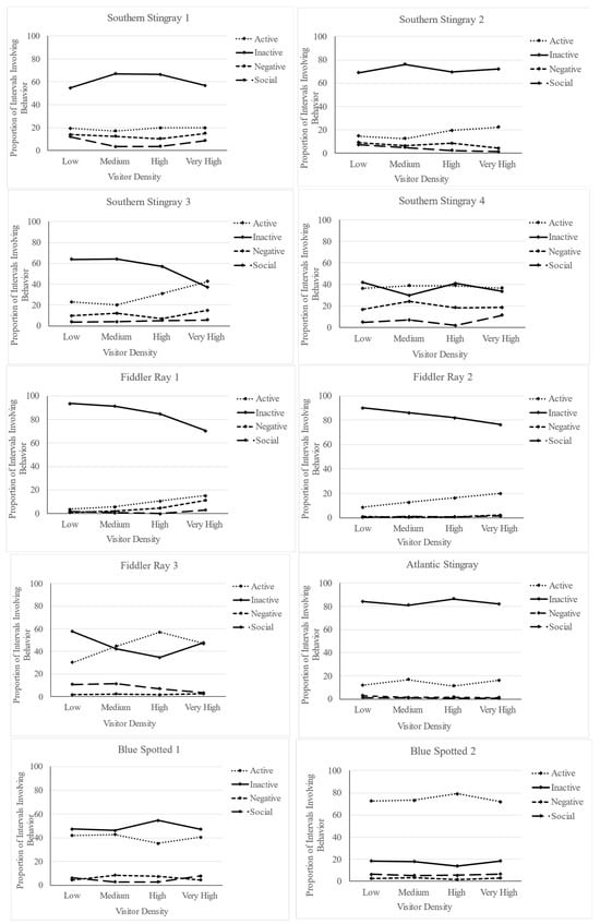Our results indicate that the rays spent a larger proportion of their time engaged in active behaviors and a smaller proportion of their time engaged in inactive behaviors as visitor density increased. However, they did not display significant differences in social or negative behaviors across visitor density levels. When we further analyzed these differences by individual, we found that all three of the fiddler rays’, and one of the southern stingrays’ active behaviors significantly differed by visitor density levels, whereas this was not found for the other three southern stingrays, the Atlantic ray, and the blue-spotted maskrays.