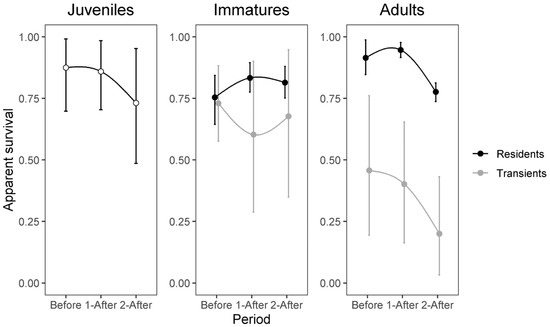 Apparent survival of juveniles, immatures, and adults before (2012–mid 2015), during (mid 2015–2018) and after (2018–2022) the waste treatment center (WTC) was opened. Estimates for newly marked (“Transients”) and previously marked (“Residents”) individuals are only differentiated for immatures and adults (see Methods). Error bars represent the 95% Bayesian credible interval.