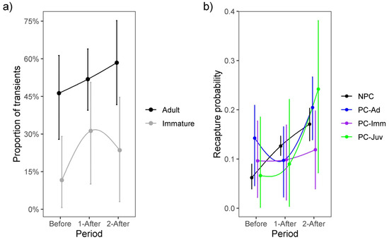 (a) Proportion of transients among newly-marked immatures and adults, and (b) recapture probability accounting for age-specific trap-response and individual heterogeneity, before (2012–mid 2015) and during the two periods after (mid 2015–2018 and 2018–2022) the waste treatment center (WTC) was opened. NPC = not-previously captured individuals, PC-Ad = previously captured adult individuals, PC-Imm = previously captured immature individuals, and PC-Juv = previously captured juvenile individuals. Error bars represent the 95% Bayesian credible interval.