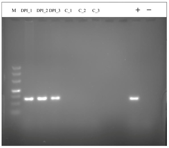 After infecting the cat with T. gondii at 10 DPI, the DNA was extracted from the intestinal epithelium and amplified using PCR. The results of gel electrophoresis showed that the experimental group was positive for the B1 gene at 10 DPI and there was no positive result for the control group (Figure 1). This demonstrates that the cat intestinal epithelium infection model was successfully established, which laid a foundation for further research.