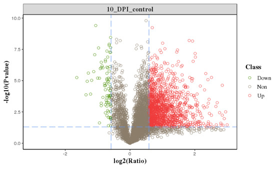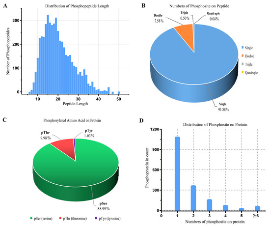 We profiled a phosphoproteomic profiling to investigate the changes in the intestinal epithelia of cats infected with the T. gondii Pru strain. In our study, iTRAQ-phosphorylated proteomics technology was used to qualitatively and quantitatively analyze the alterations in phosphorylated protein levels following T. gondii infection in cats. In this study, we obtained 247,246 spectra. Under the filtering condition of false positive FDR ≤ 0.01 at the spectral level, a total of 34,038 spectra, 4998 phosphopeptides (Table S1), and 3497 phosphorylation sites (phosphoRS probability ≥ 0.75) were identified on 1805 phosphorylated proteins. The length distribution of the phosphopeptides was primarily concentrated between 10 to 35 amino acids (Figure 2A), with the majority consisting of polypeptides modified by a single phosphorylation site (91.88%) (Figure 2B). Notably, we observed that SRRM2, SRRM1, LIMA1, CTNND1, OSBP, LMO7, NPM1, PLEC, NUCKS1, LMNA, BCLAF1, TNKS1BP1, LARP1, MAP4, MAP1B, FAM83H, and HDAC2 had more than 20 phosphorylation sites. The distribution of phosphorylated amino acid residues in the identified phosphorylation sites is illustrated in Figure 2C, with 3112 (88.99%) phosphorylated at serine (pSer), 349 (9.98%) at threonine (pThr), and 36 (1.03%) at tyrosine (pTyr). Figure 2D depicts the distribution of phosphorylation sites with each phosphorylated protein, with one phosphorylation site accounting for the majority (1090, 60.39%). The repeatability analysis, conducted using the coefficient of variation (CV), reveals that 0.44 of the total phosphoprotein is identified when the CV is 20% (Figure 3). Following conditional screening (ratio ≥ 1.5 or ≤0.667, and p ≤ 0.05), we identified 705 differentially phosphorylated proteins in this study. Among these, 637 were up-regulated, while 68 were down-regulated (Figure 4).