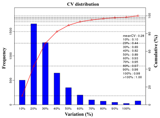 The repeatability evaluation of phosphopeptide quantification based on the coefficient of variation (CV). The percentage on x-axis represents the values of CV. The left y-axis indicates the number of phosphopeptides and the right y-axis indicates the cumulative percentage of phosphopeptides.