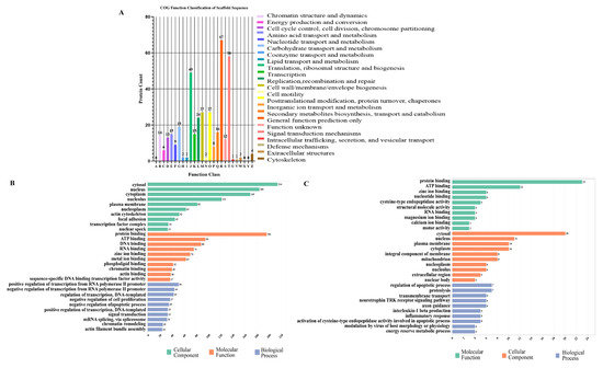 Functional classification of phosphoproteins in feline intestine infected by Toxoplasma gondii. (A) Functional annotation of the DEPs based on COG. (B) GO functional classification of the up-regulated phosphoproteins based on gene ontology. (C) GO functional classification of the down-regulated phosphoproteins based on gene ontology.